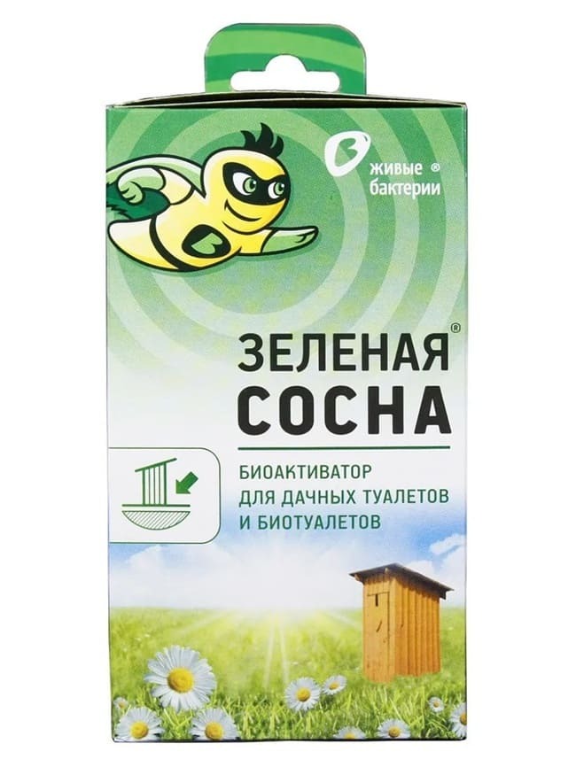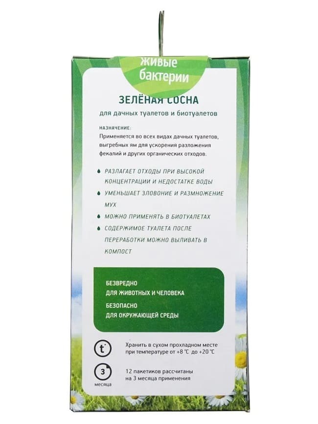 Принцип действия Зеленая сосна очень прост. Необходимая доза препарата засыпается в выгребную яму или дачный туалет. Гранулы препарата напитываются жидкостью и бактерии оживают, начиная расщеплять вязкую массу до состояния жидкости, пригодной для последующего слива в компост. Расчет дозировки Зеленая сосна для емкостей различных объемов подробно указан на упаковке продукта. Примерно раз в неделю нужно досыпать очередную дозу препарата и при необходимости добавлять воду. Высокая концентрация бактерий позволяет обойтись 300 гр. препарата (12 пакетиков) в течение трех месяцев из расчета на 1 куб.м. ем.