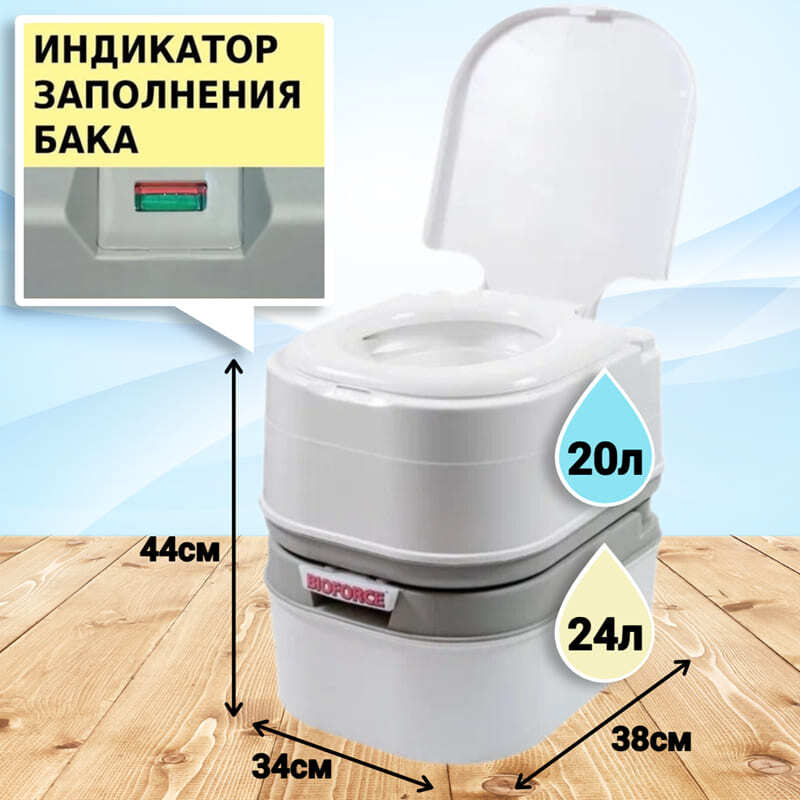 Биотуалет BIOFORCE Compact WCL 20-24 состоит из двух соединенных между собой отделений. В верхнее отделение (объем 20л) заливается обычная вода, которая необходима для смыва отходов. Отделение оборудовано механической помпой для смыва, сидением и крышкой.